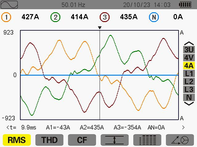 此次測量在其 ABC 電流分別為 427A 414A 435A 當(dāng)天生產(chǎn)使用其變壓器為60%,未滿負(fù)載運(yùn)行中。