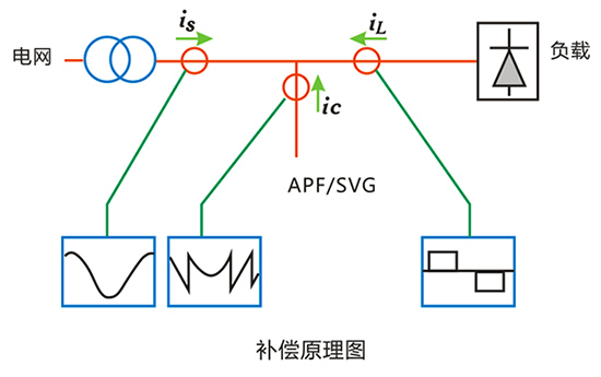 XMPQ通過外部互感器CT,實時檢測電網(wǎng)電流或者負(fù)載電流,控制器通過快速傅里葉變換提取出負(fù)載的基波電流、各次諧波電流,通過DQ旋轉(zhuǎn)坐標(biāo)得到有功、無功、負(fù)序等數(shù)據(jù),然后通過IGBT功率變換器產(chǎn)生與補(bǔ)償目標(biāo)(諧波、無功、不平衡)大小相等相位相反的補(bǔ)償電流注入電網(wǎng),實現(xiàn)對電網(wǎng)側(cè)的電能質(zhì)量改善功能。