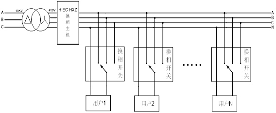 三相負(fù)荷不平衡自動(dòng)調(diào)節(jié)裝置系統(tǒng),由一臺(tái)主機(jī)及多臺(tái)分機(jī)(15~20臺(tái))組成,應(yīng)用于配電變壓器低壓側(cè)(220/380V),主機(jī)及數(shù)據(jù)采集裝置安裝于配電變壓器低壓側(cè),各分機(jī)分別安裝于終端用戶表前側(cè),通過無線通訊方式組成調(diào)控網(wǎng)絡(luò),系統(tǒng)主機(jī)采集配變各相負(fù)荷實(shí)時(shí)參數(shù),經(jīng)計(jì)算后以無線通訊方式控制各分機(jī),各分機(jī)采用專用換相開關(guān)組件,將所接入的用戶負(fù)荷實(shí)時(shí)切換到合適的相別上,使配變低壓側(cè)負(fù)荷基本保持在平衡狀態(tài),從而達(dá)到減少線路損耗、變壓器損耗和延長變壓器使用壽命,提高供電質(zhì)量的目的。
